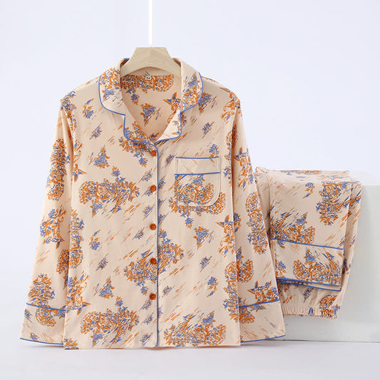 Ownkoti Vintage Bamboo Print Cotton Gauze Beaded Button Loungewear Set