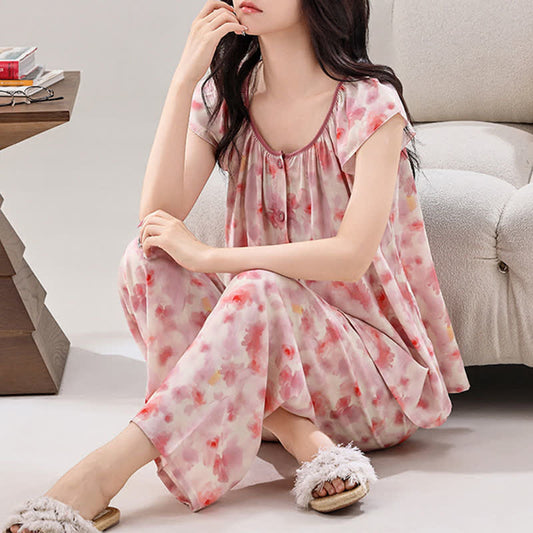 Ownkoti Floral Flutter Sleeve Button Front Pajamas