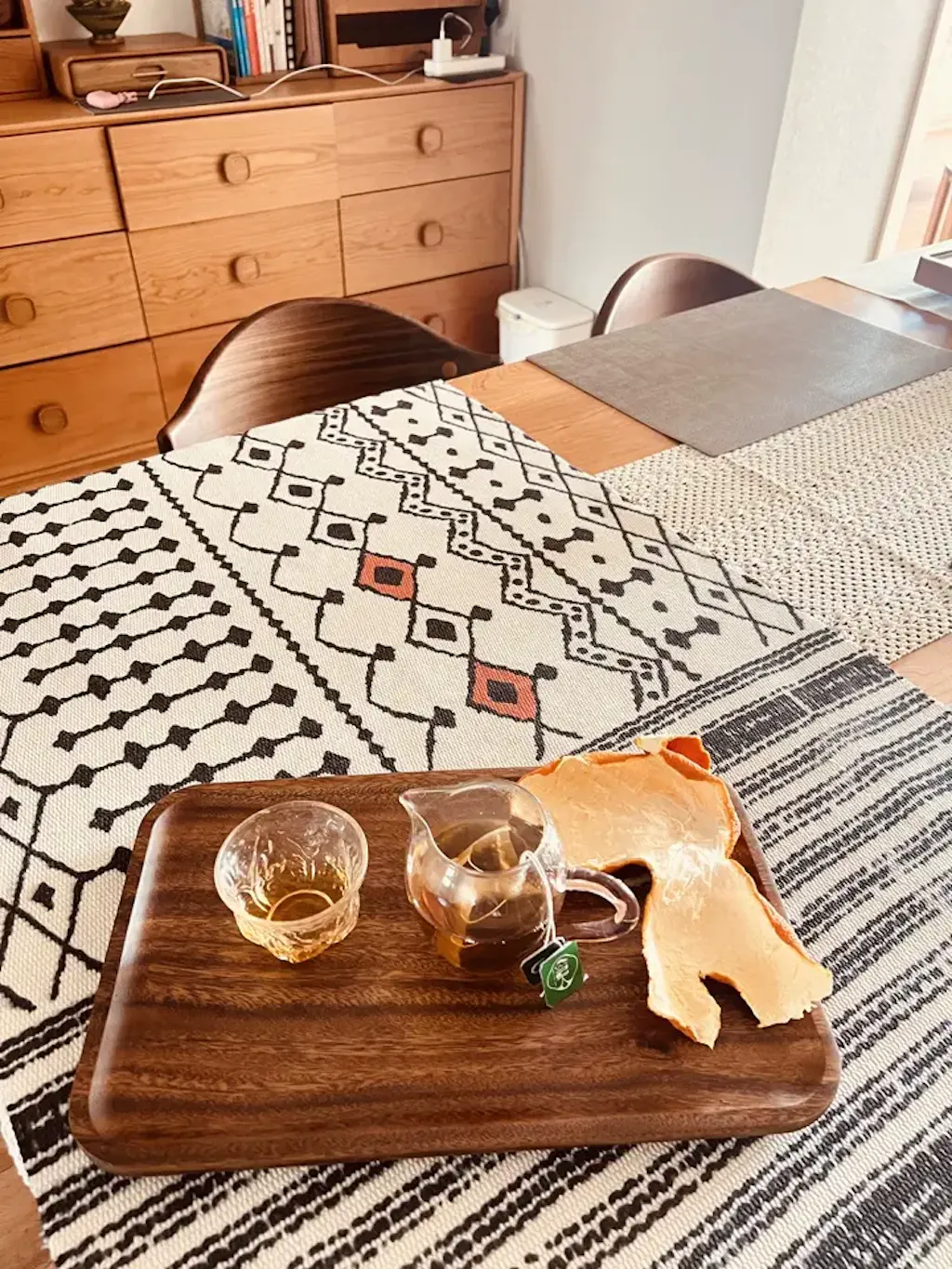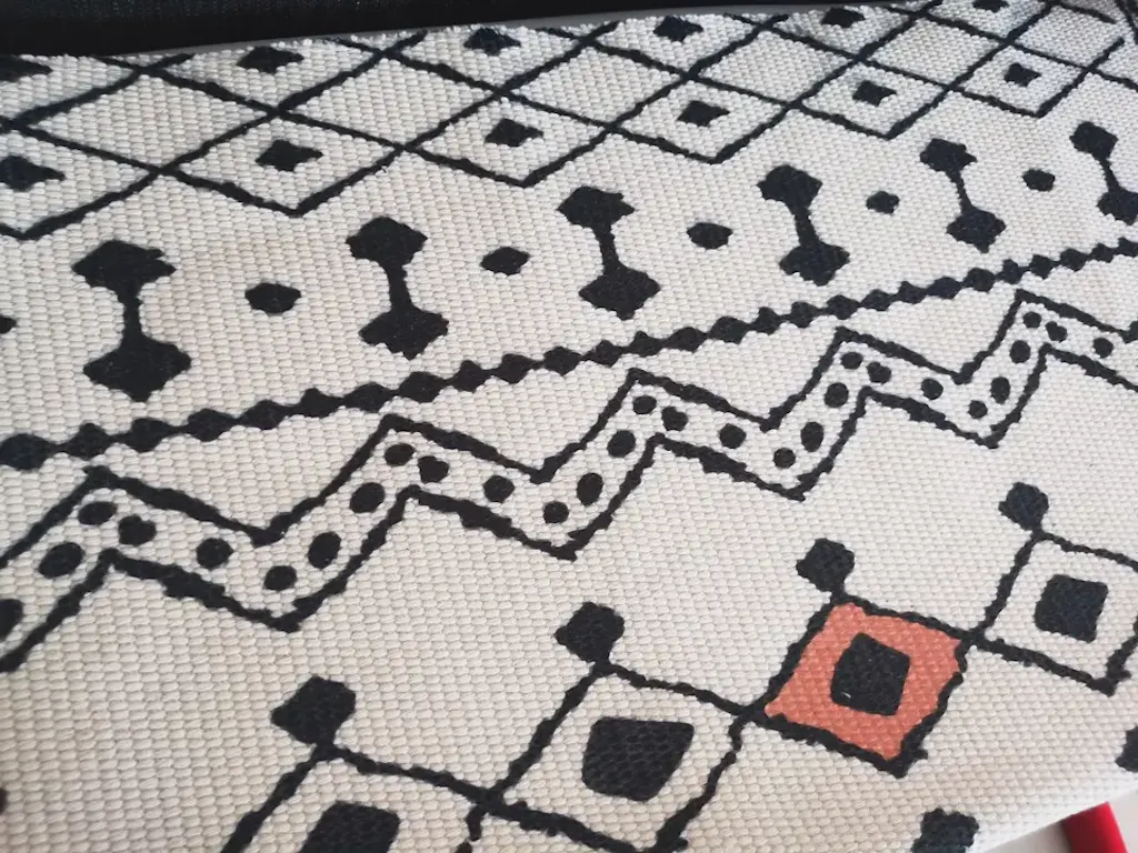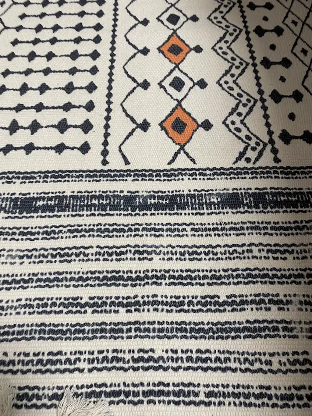 Elevate your home with this minimalist Nordic-inspired mat. Made from a soft cotton-linen blend, it showcases intricate black geometric patterns on a natural beige base, adding timeless elegance to any room. Its lightweight, breathable fabric is perfect for year-round use, and the tasseled edges bring a cozy, handmade touch. Versatile enough to drape over a chair, sofa, bed, or serve as a floor mat, this throw combines comfort with modern style.