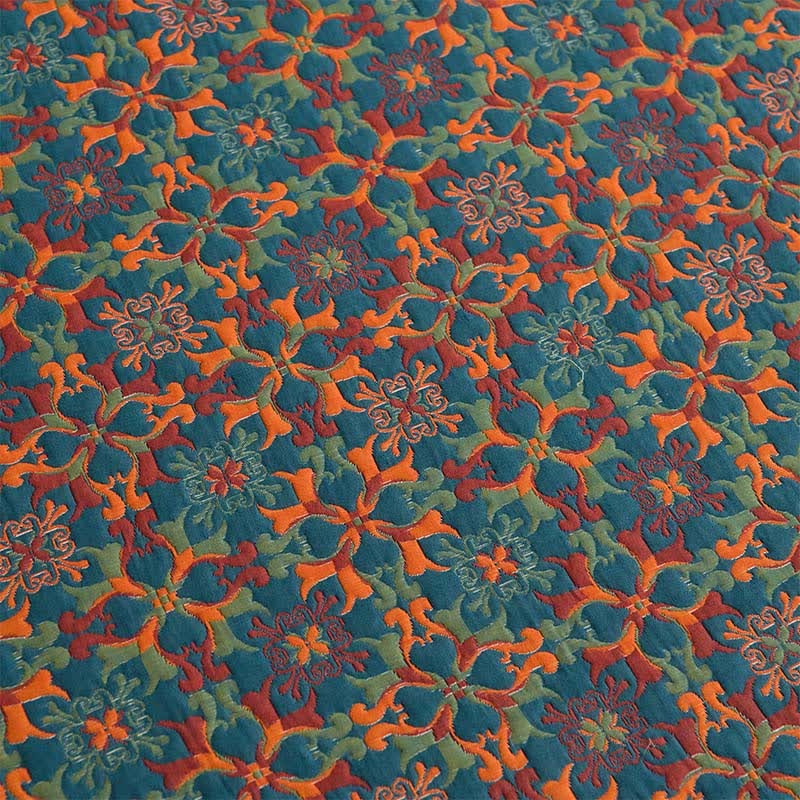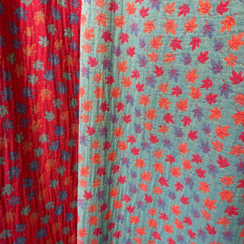 This exquisite fabric features a vibrant array of multicolored leaves, intertwining like...