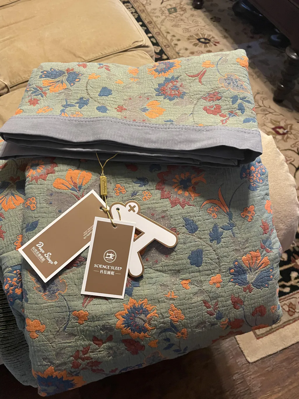 Embroidered flower pattern with bright color, the retro style quilt adds romance and sophistication to your room. Reversible double-side design, which adds reliable strength for use and wash. Adopted with reactive printing and jacquard technology. This quilt is suitable as a daily blanket for summer or a bedsheet on your bed. It also can be used as an air conditioning blanket, airplane blanket, bedside towel, sofa blanket, shawl blanket.