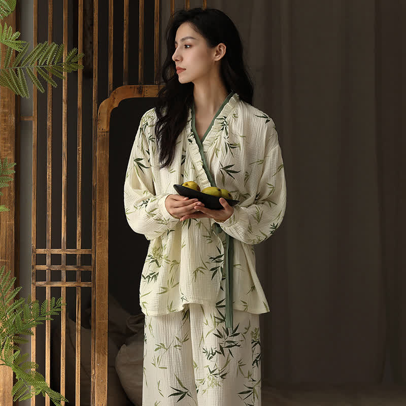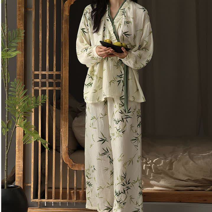 Ownkoti V-neck Bamboo Cotton Gauze Pajama Set