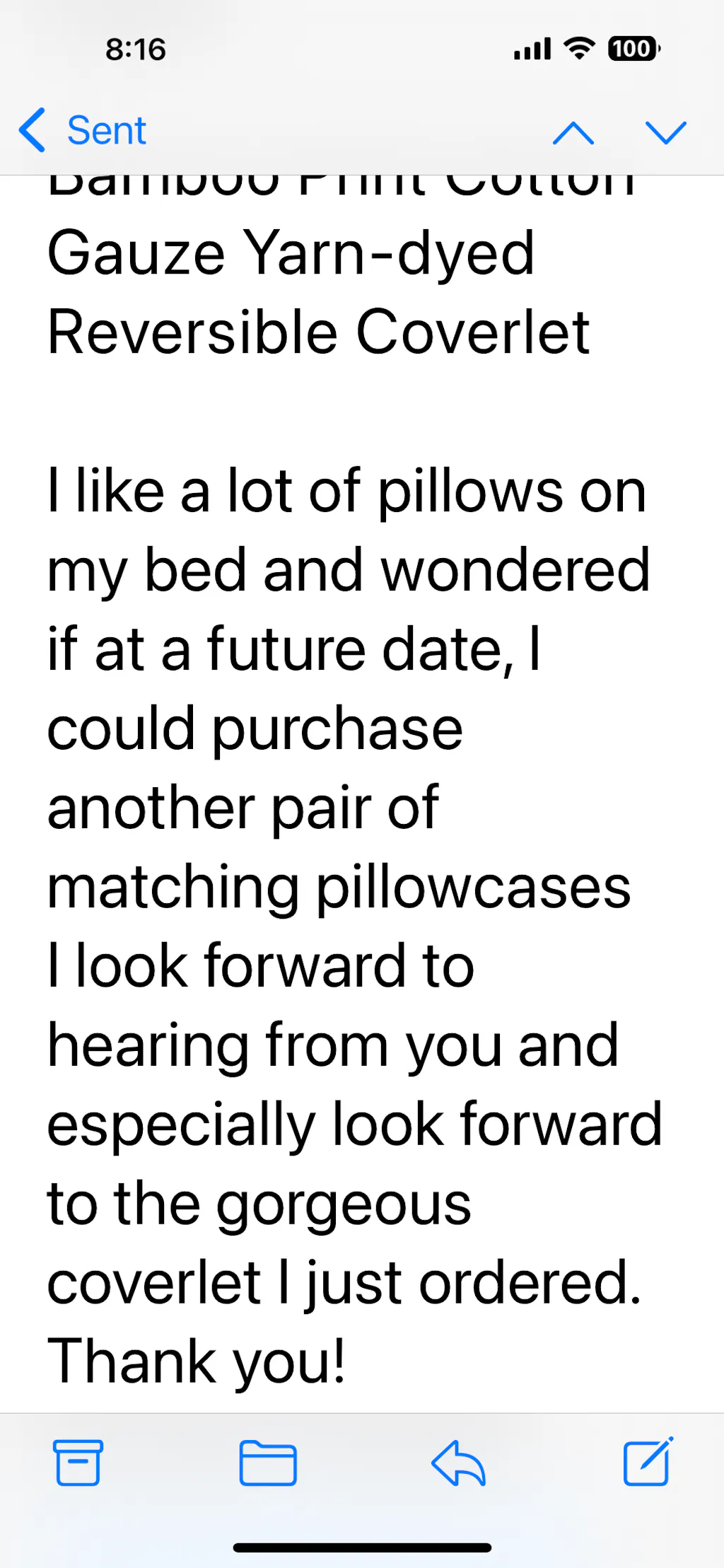 The product is gorgeous. I did send an email on June 6 about ordering additional pillowcases but you never replied.