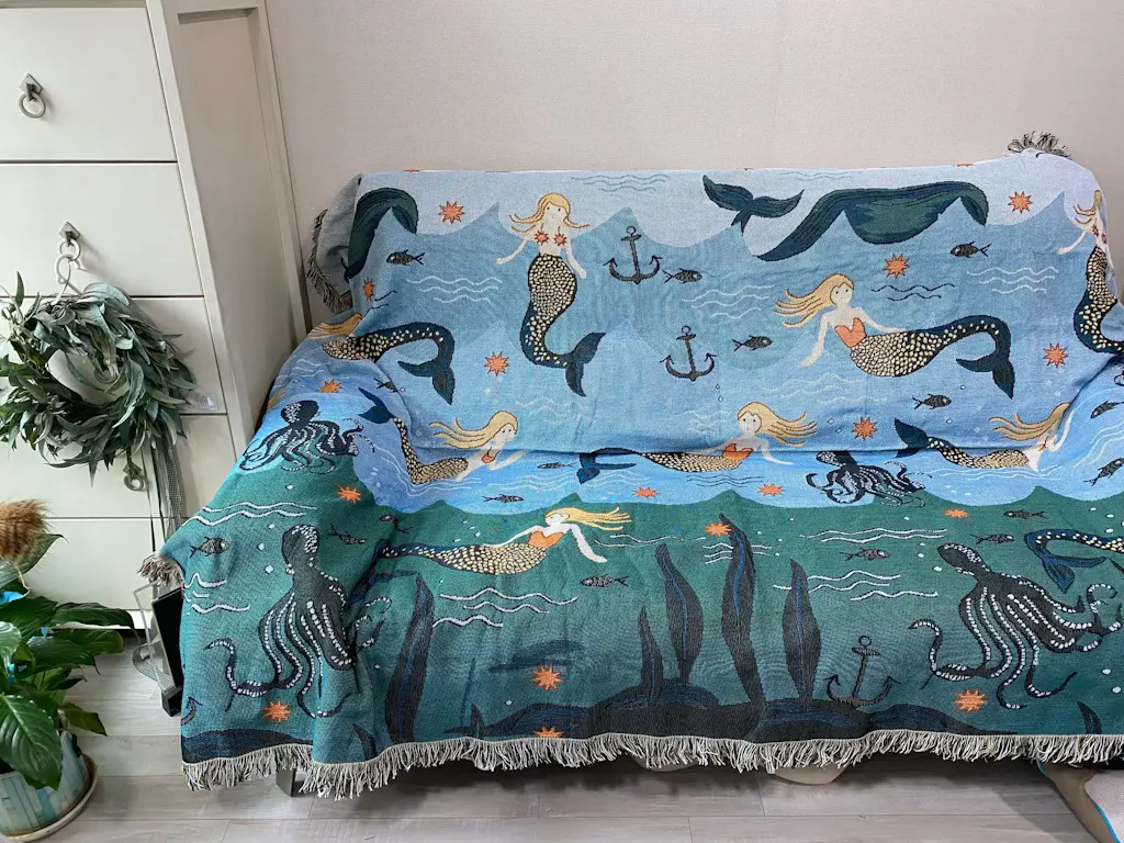 Mermaid full-cover sofa towel: Who moved the mermaid's tail? Who lifted the octopus's claws? A childlike tapestry can liven up the atmosphere of the whole living room. The combination of the animals from the bottom of the sea and the indoor carpet is soft and proud, satisfying your forever childlike innocence.