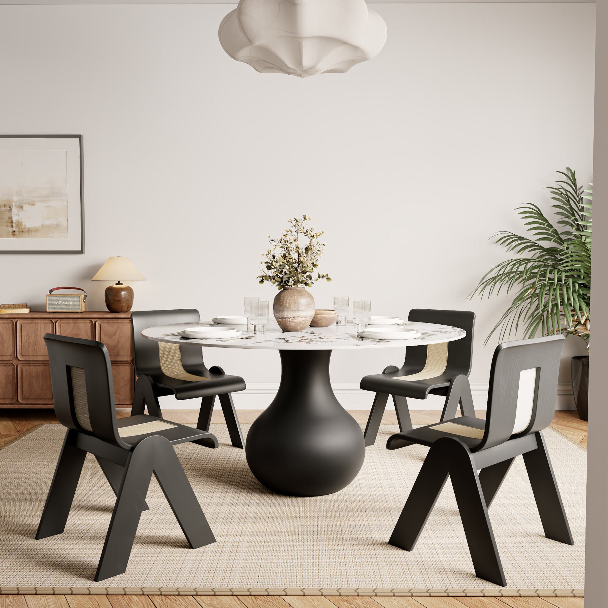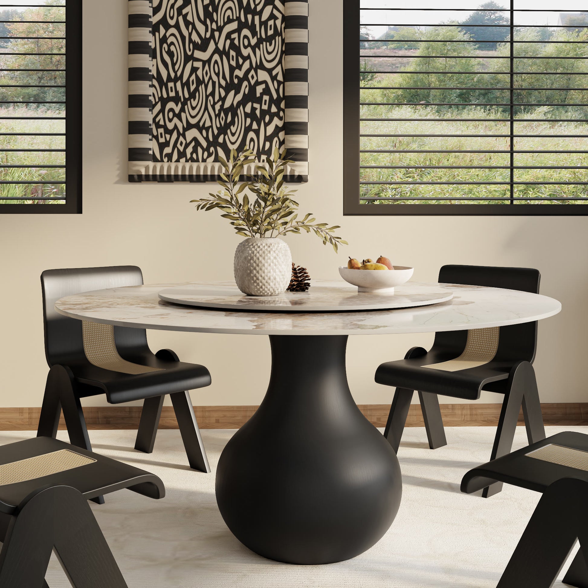 - Luxury Meets Mid-Century Style: This striking Dining table masterfully blends opulent materials with retro-modern flair. The bold sintered stone tabletop captivates with its flawlessly rounded edges, achieved through precision automated edge-banding technology—a seamless marriage of innovation and safety that erases sharp angles while maintaining organic, mid-century-inspired curves. Below, the black solid wood base reimagines classic mid-century silhouettes with cylindrical silhouette with nature tree grain, evoking both timeless sophistication and approachable warmth.