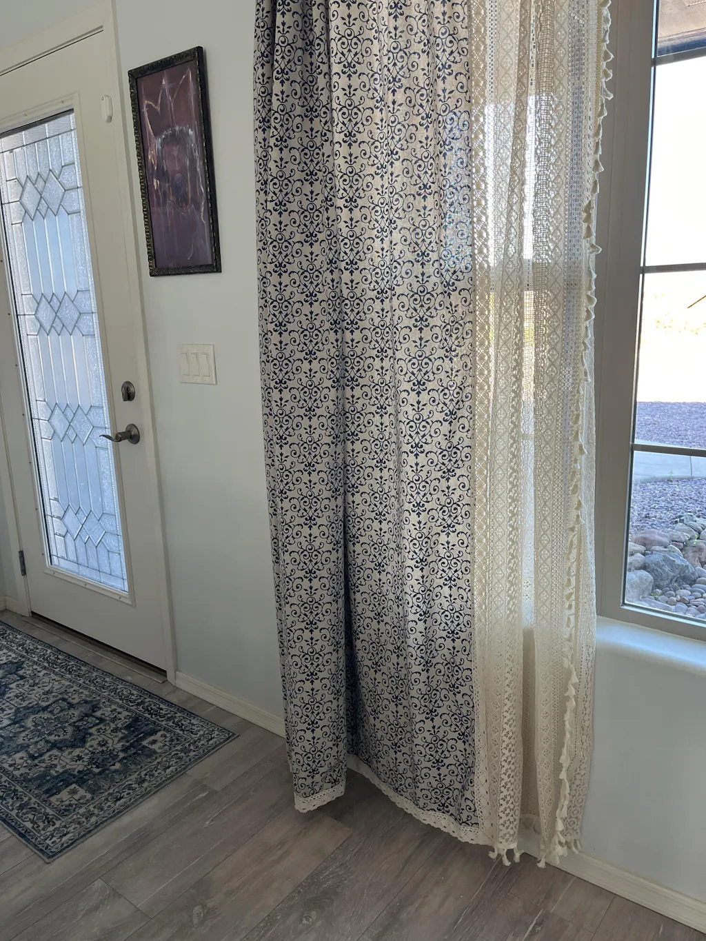 Beautiful. Material lets minimal light through and is great for privacy BUT it will not completely darken the room like a black out curtain. Love the Beige lace detail. Very happy with my purchase.