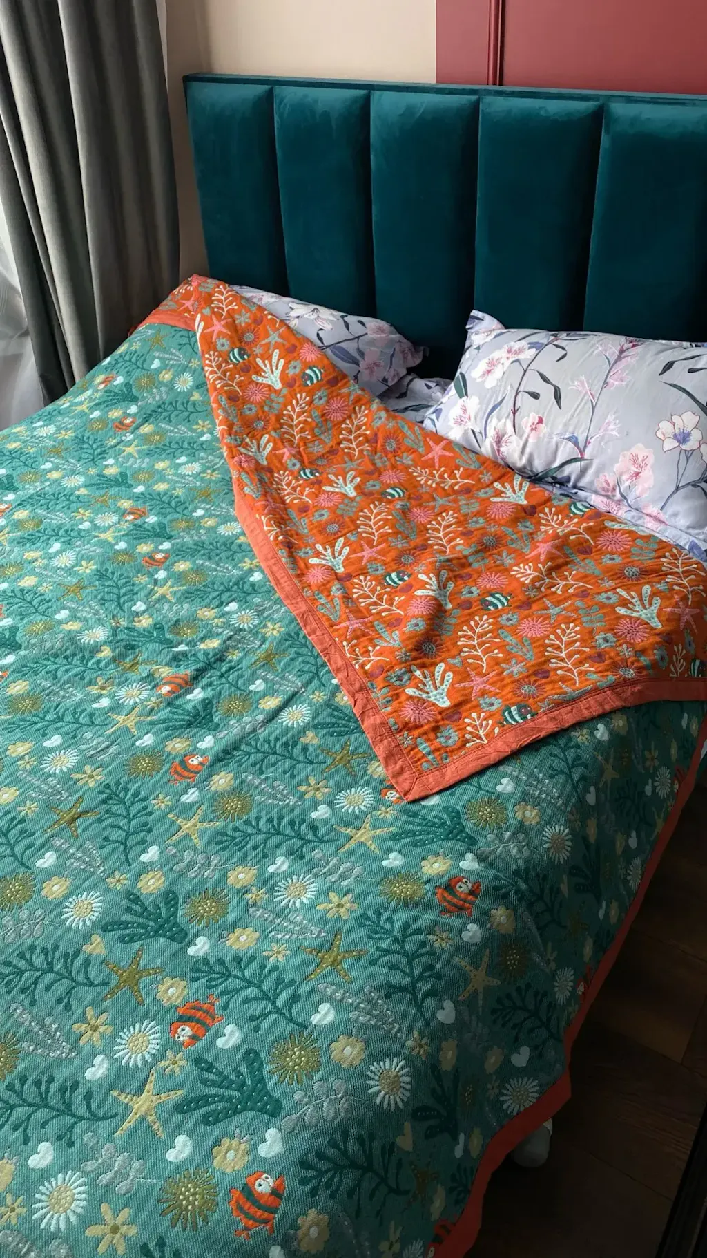 Ownkoti Dark Cyan Double-Sided Floral Cotton Quilt