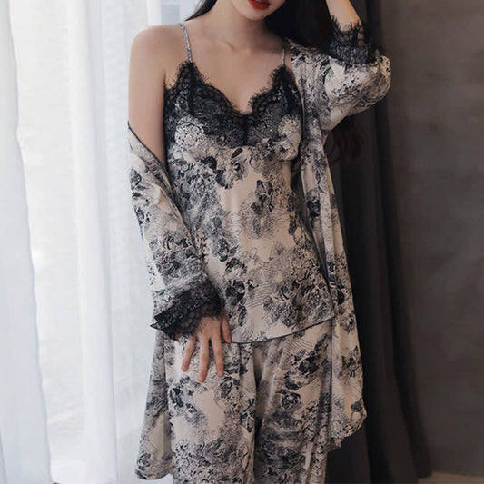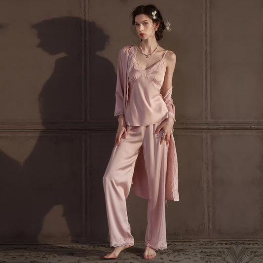Ownkoti Elegant Silky Lace Trim Loungewear Set(3PCS)