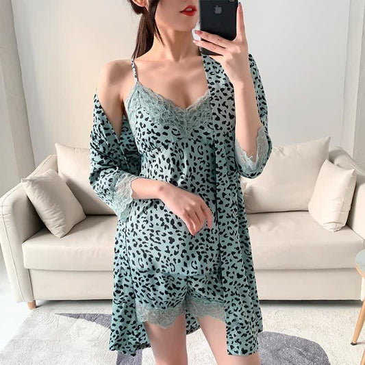 Ownkoti Leopard Lace Trim Cami Shorts Robe Set