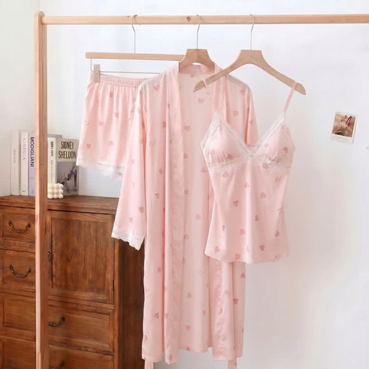 Ownkoti Heart & Bow Lace Trim Cami Pajama Set(3PCS)