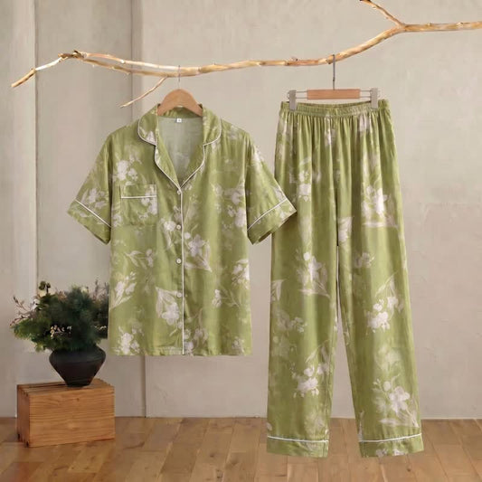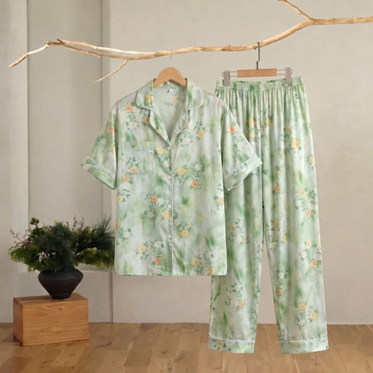Ownkoti Elegant Green Floral Silky Loungewear Set