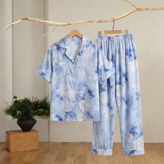 Ownkoti Blue Watercolor Floral Silky Loungewear Set