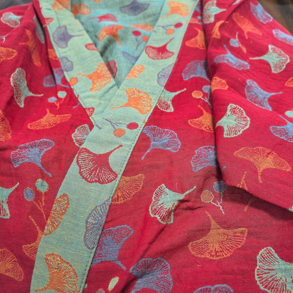 The details on this robe are amazing. The stitching is neat and durable, and the ginkgo jacquard pattern looks so delicate up close. Even the inside green lining is finished beautifully.