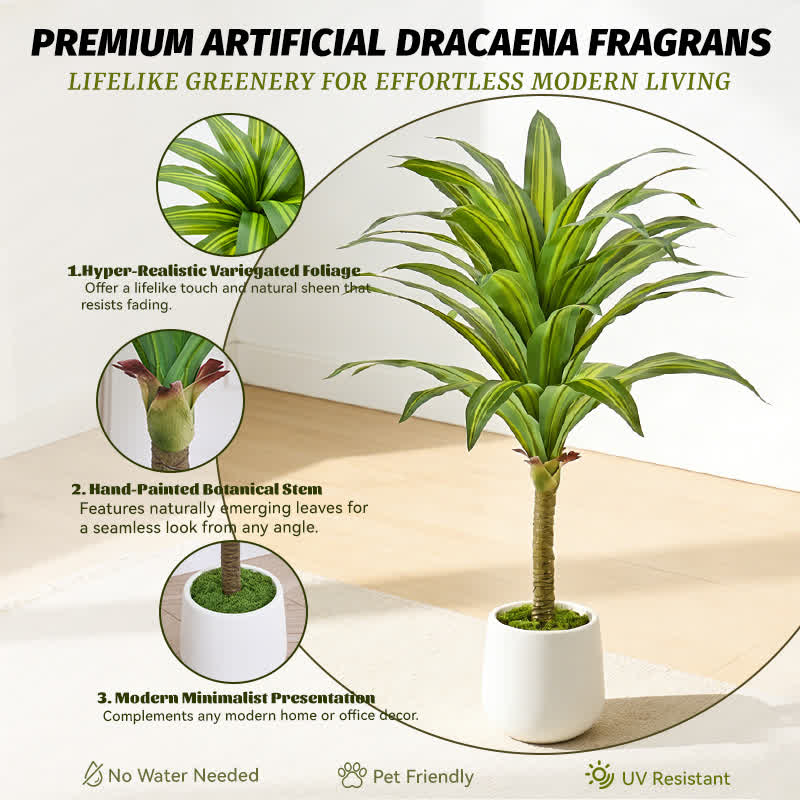 • Hyper-Realistic Details: The leaves feature natural color transitions from deep green to vibrant chartreuse, mimicking the texture and life of a real Dracaena Fragrans.